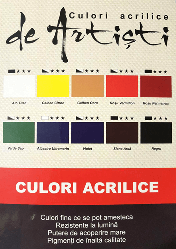 Cutia contine 10 tuburi cu 22ml de pigment: alb titan , galben citron, galben ocru, rosu vermilion, rosu permanent, verde sap, albastru ultramarin, violet, umbra arsa, negru.