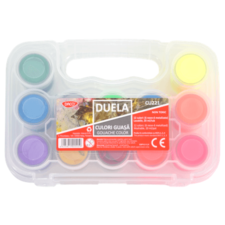 Acuarele in borcane din plastic, cu capac, Daco Duela cu 12 culori : 6 metalizate si 6 neon
