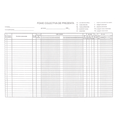 Foaie colectiva de prezenta , 100 file , orizontala. Formulare tipizate