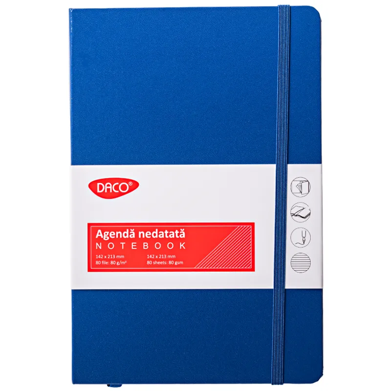 Agendă nedatată DACO AN527 Albastra , format A5 (142 x 213 mm), cu 80 file din hârtie albă si colțuri rotunjite