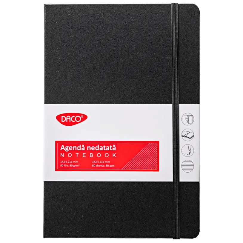 Agendă nedatată DACO AN527 Neagra, format A5 (142 x 213 mm), cu 80 file din hârtie albă si colțuri rotunjite