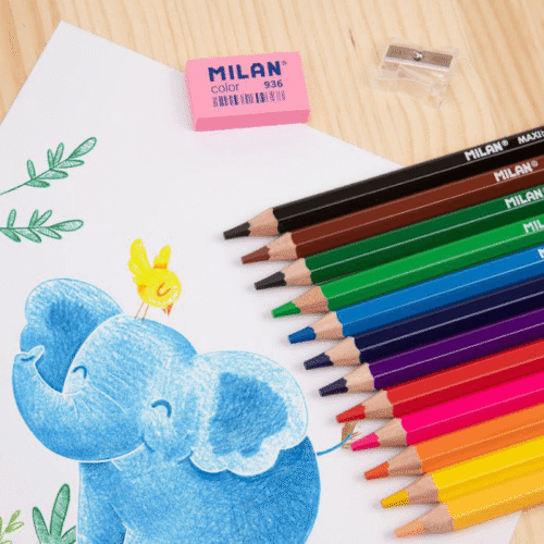 Creioane colorate groase Milan , 12 culori , mina groasa , moale , culoare intensa , ascutitoare inclusa,