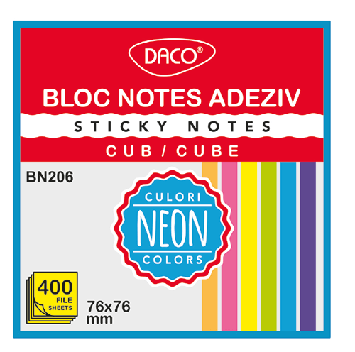 Cub notes cu adeziv Daco 76×76 mm mm in 6 culori neon