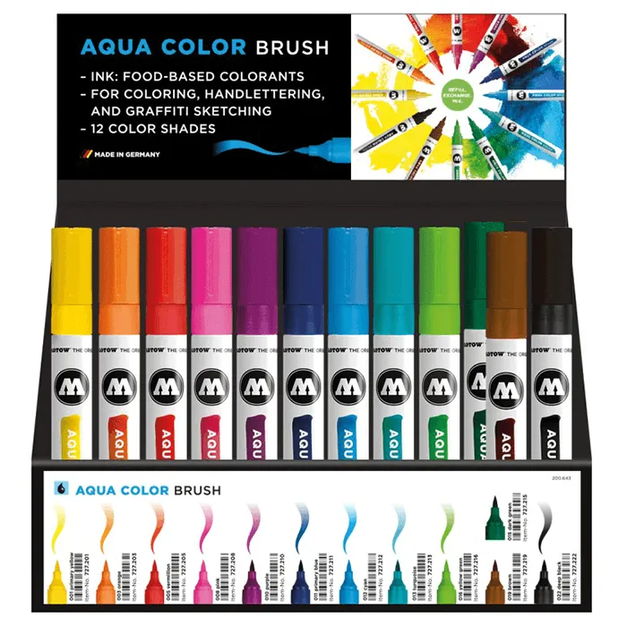 Markerele Molotow AQUA COLOR BRUSH impresionează prin cerneala intensă a culorilor și vârful tip pensulă, elastic, stabil dimensional.