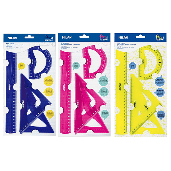 Setul contine: liniar 30 cm, echer 90º / 45º / 45º , echer 90º / 60º /30º, raportor 180º 10 cm