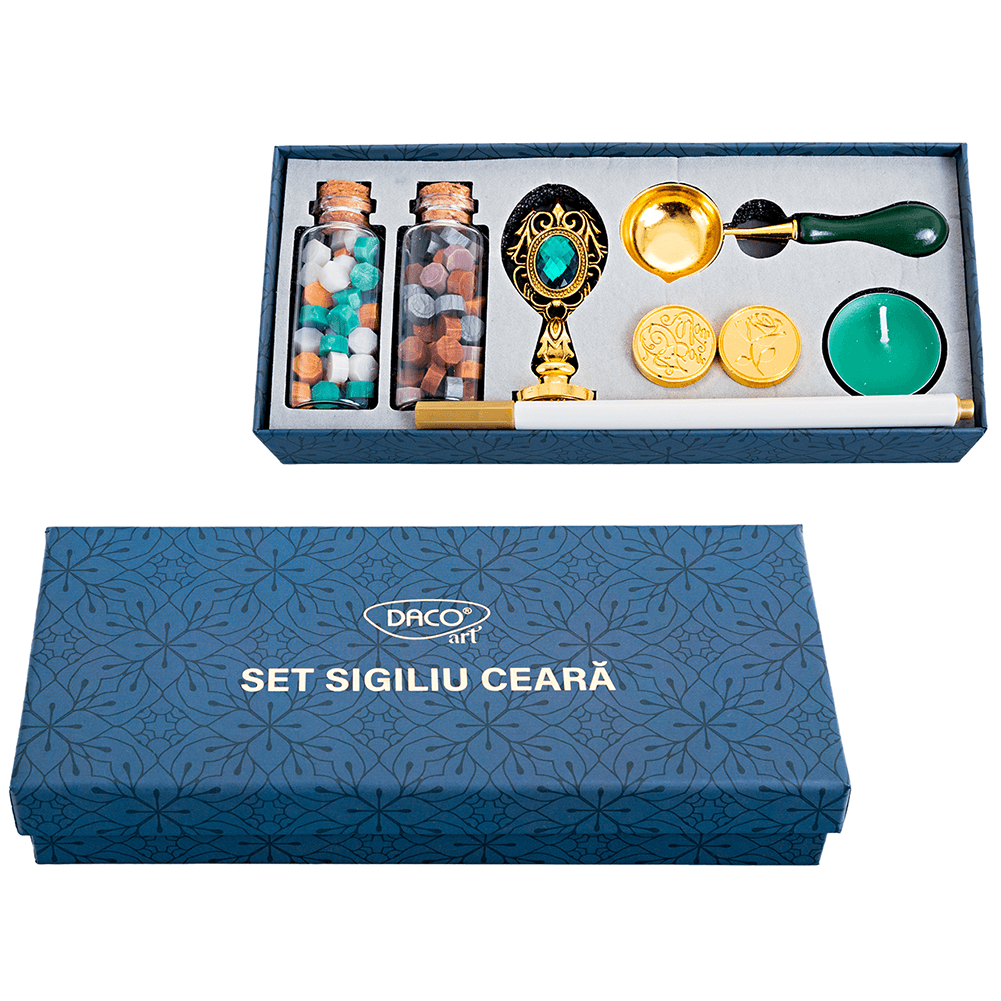 Set sigiliu ceara Daco SC078 cu 3 modele de sigiliu si rezerve de ceara